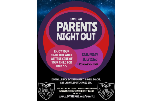 Beginning August 2022, every 3rd Friday of each month, Davie PAL will be hosting a night filled with fun activities for your child. The cost is $25 per child, which includes food and snacks.